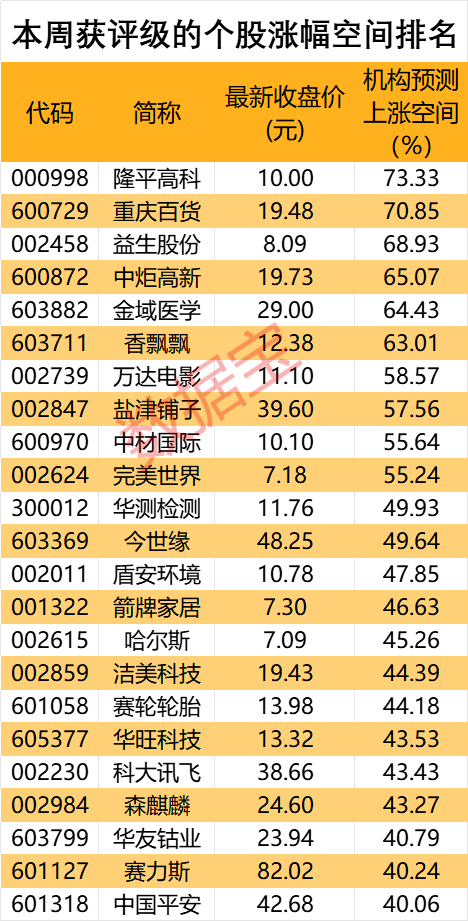 据数据宝统计,本周获2家及以上机构评级的个股中,23股最新收盘价较机构一致预测目标价上涨空间超40%。