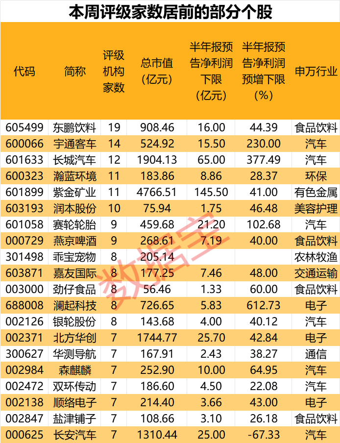 本周,机构关注度最高的是东鹏饮料,共19家机构参与评级;其次,宇通客车、长城汽车分别有14家、12家机构评级。另外,赛轮轮胎、银轮股份、森麒麟、双环传动、长安汽车、比亚迪等多只汽车股均有5家及以上机构评级。