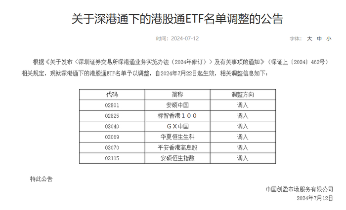 另一方面,根据《沪深港通业务实施办法(2024年修订)》有关规定,南向港股通共有6只ETF调入,自7月22日起生效。扩容后,南向港股通将共有16只ETF,分别来自7家ETF发行人。