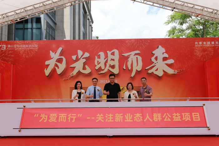 同时,为了感谢新业态劳动者——快递员、网约外卖员、网约车司机等,对佛山城市发展的辛勤付出,佛山爱尔卓越眼科医院联合佛山市总工会及佛山市新闻传媒中心,特别推出“为爱而行”——关注新业态人群公益项目,为患有角膜盲症的新业态困难人群资助总金额20万元。活动期间,新业态劳动者可以在医院一楼领取矿泉水、雨衣或太阳眼镜。