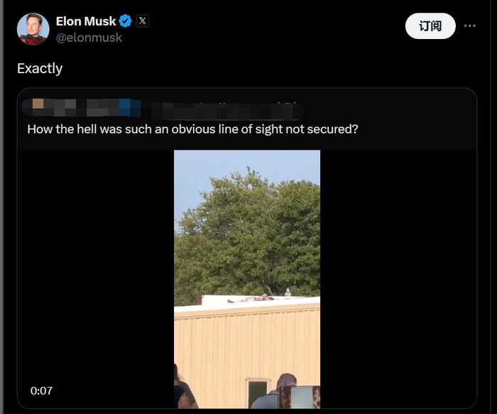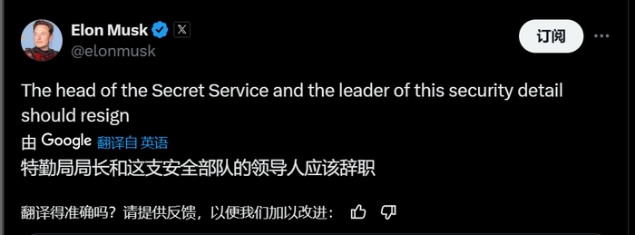 随后,马斯克还表示,“特勤局局长和这支安全部队的领导人应该辞职”。