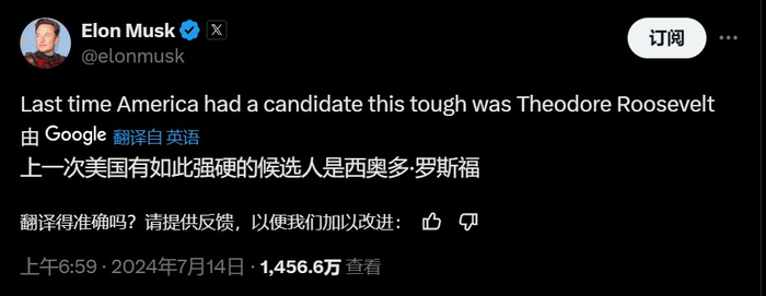 同时,当地时间14日,亿万富豪、特斯拉CEO马斯克在社交媒体发帖称,“我完全支持特朗普总统,并希望他(特朗普)早日康复。”他还表示,“美国上一次出现如此强悍的候选人,还是西奥多·罗斯福。”