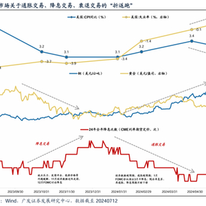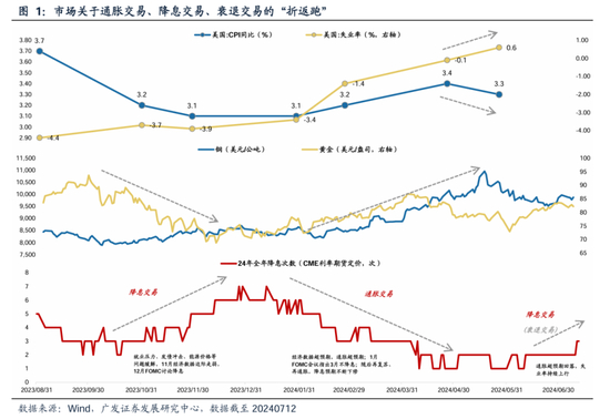 自自去年四季度以来,美国的通胀交易、降息交易、衰退交易一直在“折返跑”。去年四季度,美联储“降息交易”抬升,主要是驱动力是美国就业压力、财政部发债冲击、能源价格等问题缓解,叠加11月经济数据边际走弱,12月FOMC讨论降息,到了年底,市场对24年全年的降息预期最高定价到7次。但今年年初以来,随着经济数据超预期、通胀超预期,叠加1月FOMC会议指出3月不降息,市场转向了“通胀交易”;随后再复苏、再通胀的证据不断强化,降息预期也不断下修,到了4-5月,24年全年的降息预期下修到仅有1次。而在近期公布了6月份的通胀数据和失业数据之后,市场交易风向又再次转至“降息交易”。