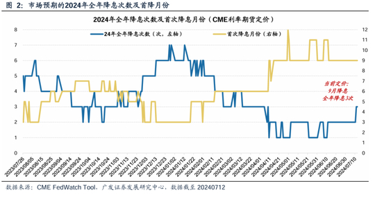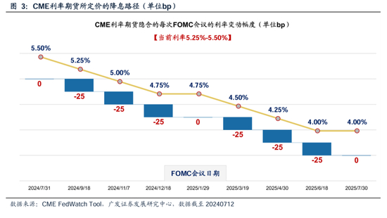7月10日,鲍威尔在听证会上表示“美联储不需要等到通胀降至2%才开始降息”。次日公布的6月份通胀数据继续降温似乎给了最好的回应,进一步接近美联储降息的“门槛”。根据CME FedWatch Tool,当前市场定价美联储9月降息、全年降息3次。