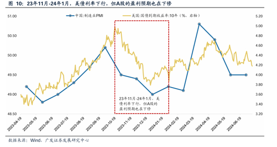 比如23年11月-24年1月,美债利率持续下行了超过100个bp,这有助于全球权益资产的风险偏好提升;但与此同时,A股资产的盈利预期持续走弱的盈利(PMI在50下方且进一步走低),较弱的基本面成为A股资产定价的核心因素,市场表现依旧很难有起色。