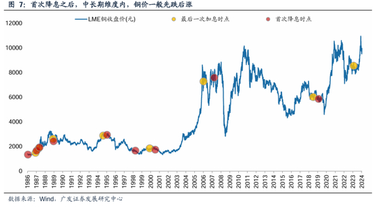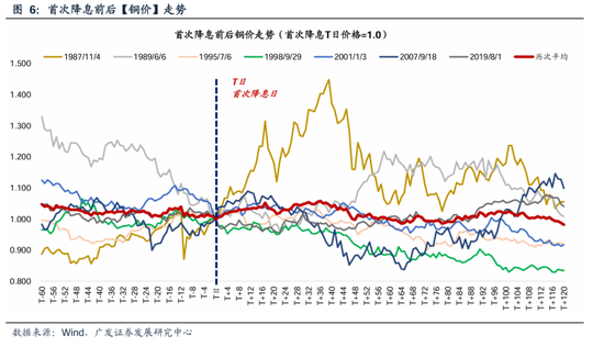(2)铜价:首次降息之后,铜价延续震荡走势,多数时候价格中枢小幅回落。历次首次降息之后的走势平均来看:60个交易日涨幅持平、120个交易日平均下跌2%。商品价格在降息前后一般先定价经济的不确定性,再定价经济的再复苏,因此商品价格一般先跌后涨,下跌的幅度和时长则取决于经济是软着陆还是硬着陆。