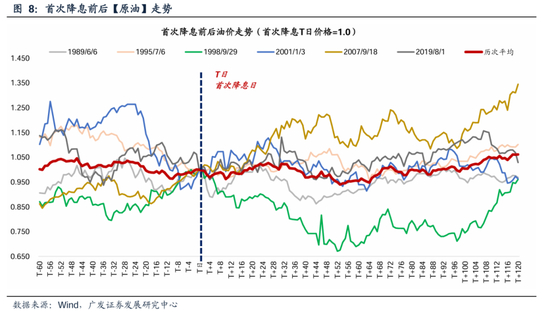 (3)油价:首次降息之后,油价延续震荡走势,中期维度看多数时候呈现先跌后涨的走势。历次首次降息之后的走势平均来看:60个交易日下跌5%、120个交易日平均上涨6%。