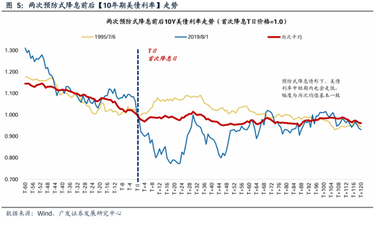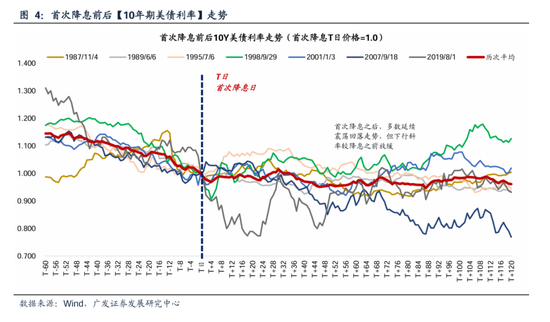 (1)10年期美债利率:首次降息之后,10年期美债利率多数时候延续震荡回落走势,但下行斜率较降息之前放缓。平均来看:60个交易日下跌3.5%、120个交易日平均下跌4%。预防式降息情形下(1995年、2019年),美债利率中短期内也会走低,幅度与历次均值基本一致。