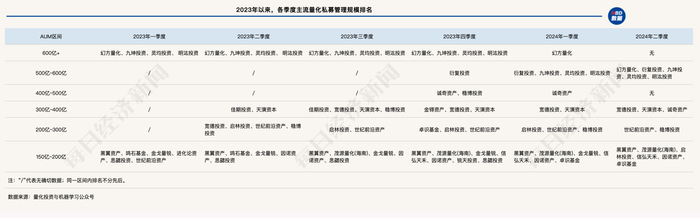 经过二季度的洗礼后,截至今年6月30日,600亿+梯队已成“无人区”;400亿~500亿元梯队也出现了空档。幻方量化二季度规模降至500亿~600亿元,诚奇资产跌入300亿~400亿元梯队,启林投资则退出200亿~300亿元梯队。
