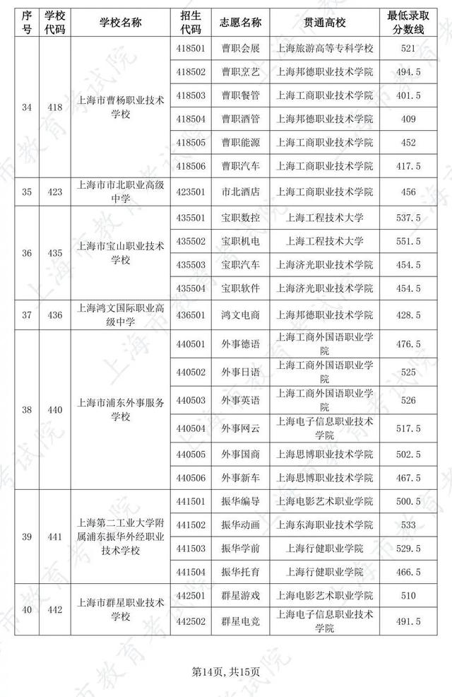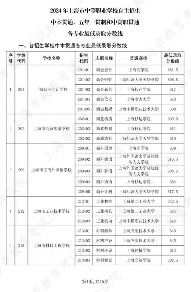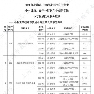 沪2024 年中职校自主招生中本贯通、五年一贯制和中高职贯通各专业最低录取分数线公布 媒体滚动 2024.07.14 17:00 转自:上观新闻2024 年上海市中等职业学校自主招生中本贯通、五年一贯制和中高职贯通各专业最低录取分数线公布,详见↓ 编辑:季昕
