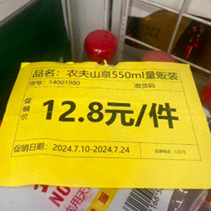 在连锁超市红旗连锁(002697.SZ)某门店内,农夫山泉红瓶饮用天然水原价18元/件,现促销价12.8元/件,每件规格为12瓶,一瓶550ml,折算下来单瓶价格约1.07元。同一门店的怡宝饮用纯净水原价16.5元/件,现促销价9.9元/件,每包规格为12瓶,一瓶350ml,折算下来单瓶价格约0.82元。