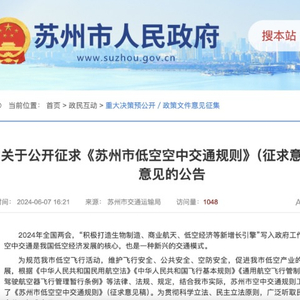 其中,在服务管理中,苏州将建立低空飞行服务管理机构,接受空中交通管理机构业务指导,通过市级低空服务管理平台,收集全市低空飞行以及有关活动需求,为低空飞行提供实时化、专业化、全过程保障服务。