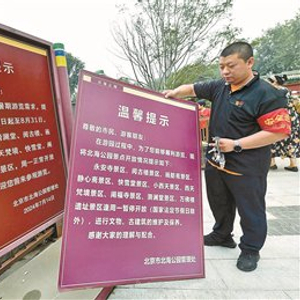 据北海公园信息传媒科负责人张磊介绍,7月14日当天,公园在五个门区全部更新温馨提示牌,同时对园中园景区门口“周一闭园”的牌示进行了更换,向游客广泛宣传新规,方便暑期游览。