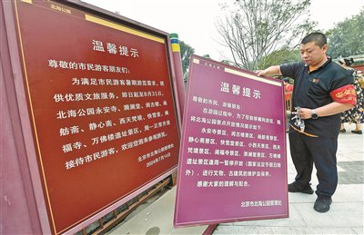 昨天下午,北青报记者来到北海公园。北门外,工作人员正在摆放提示牌,吸引不少游客的关注。只见提示牌上写着:即日起至8月31日,北海公园永安寺、漪澜堂、阅古楼、画舫斋、静心斋、西天梵境、快雪堂、阐福寺、万佛楼遗址景区,周一正常开放接待市民游客,欢迎您前来参观游览。