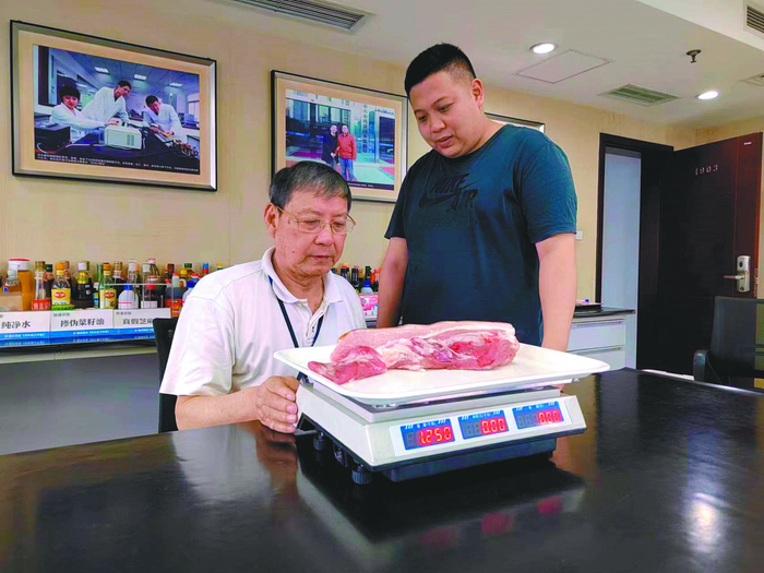 吕长富正在演示,1公斤肉作弊秤称出1.25公斤。