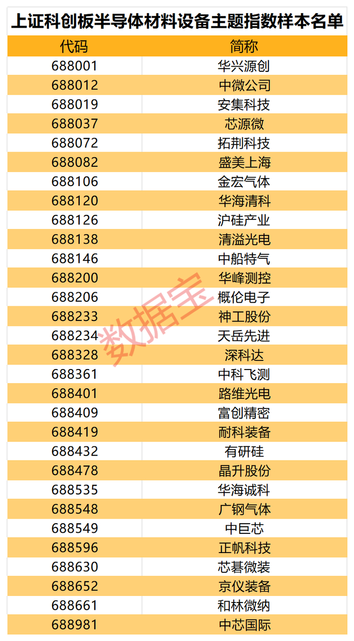 上证科创板半导体材料设备主题指数选取科创板内业务涉及半导体材料和半导体设备等领域的30家上市公司证券作为指数样本,以反映科创板半导体材料和设备上市公司证券的整体表现。