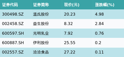 截至午间收盘,乳业主题涨跌幅最高的五只股票为:温氏股份(300498.SZ)、益生股份(002458.SZ)、光明乳业(600597.SH)、伊利股份(600887.SH)与洽洽食品(002557.SZ)。详情见下表: