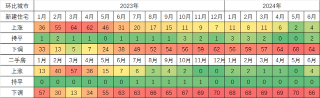 6月份,70个大中城市中,新建商品住宅和二手住宅销售价格环比下降城市分别有64个和66个,均比上月减少4个。