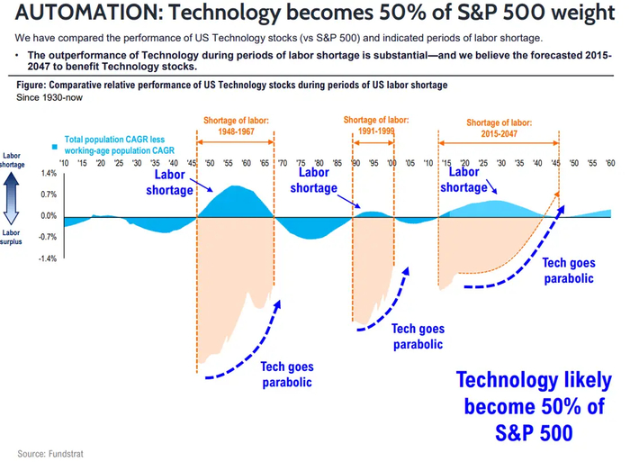 随着越来越多的公司在技术上投入数万亿美元,以解决全球劳动力短缺问题,这将推动科技板块在标准普尔500指数中的占比达到50%。科技板块目前占该指数的30%左右。