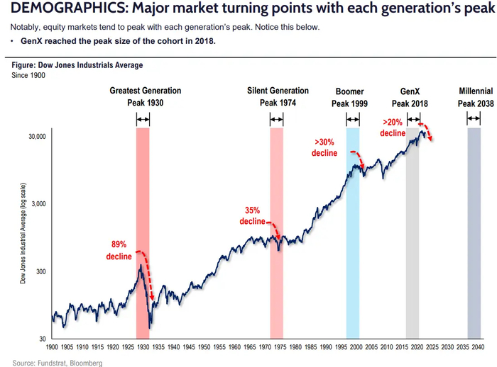 例如,当最伟大的一代在1930年达到顶峰时,恰逢股市持续多年的熊市;时间快进到1974年,“沉默的一代”达到峰值,美股股市也同时经历了持续数年的约35%的痛苦回调;婴儿潮一代在1999年达到顶峰,就在一年后,股市陷入了长达数年的熊市。