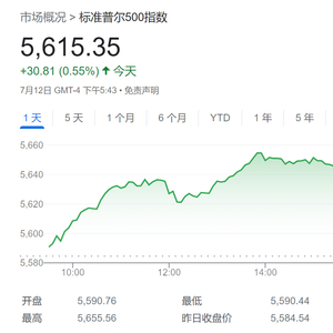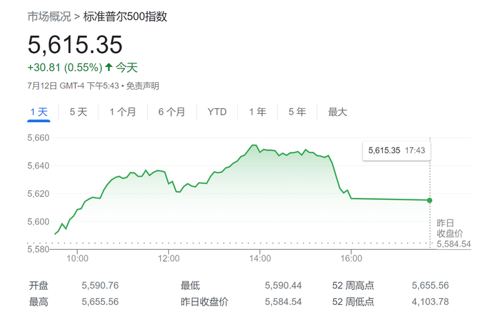 截至上周五美股收盘,标普500指数涨0.55%,报5,615.35点。