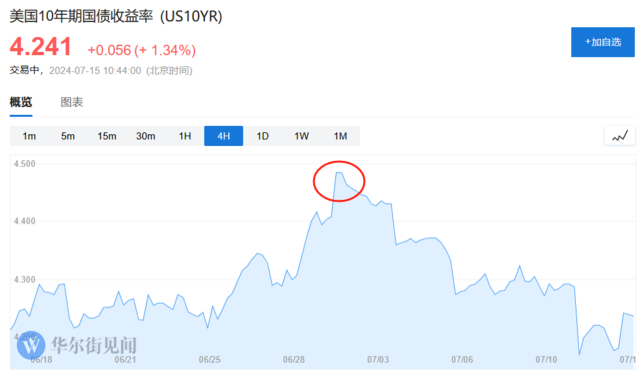 像是美国总统拜登在6月底的大选辩论中不敌特朗普后,10年期美债收益率持续飙升,一度逼近4.5%关口。