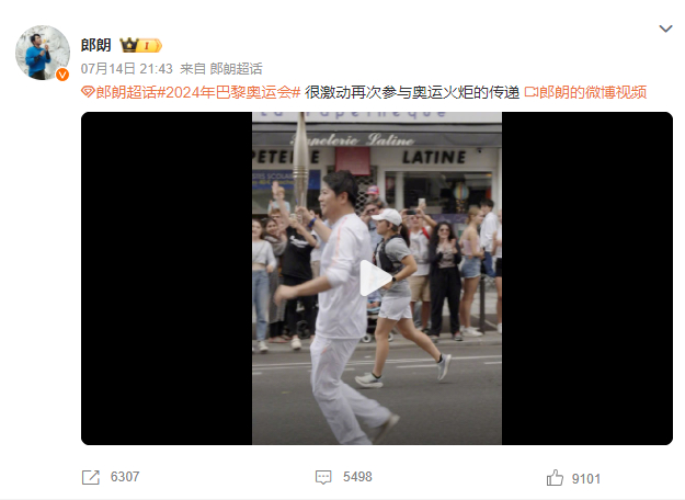 14日参加传递奥运火炬的中国知名钢琴演奏家郎朗事后发文称,他在当地时间7月14日下午2时45分登场,很激动再次参与奥运火炬的传递。