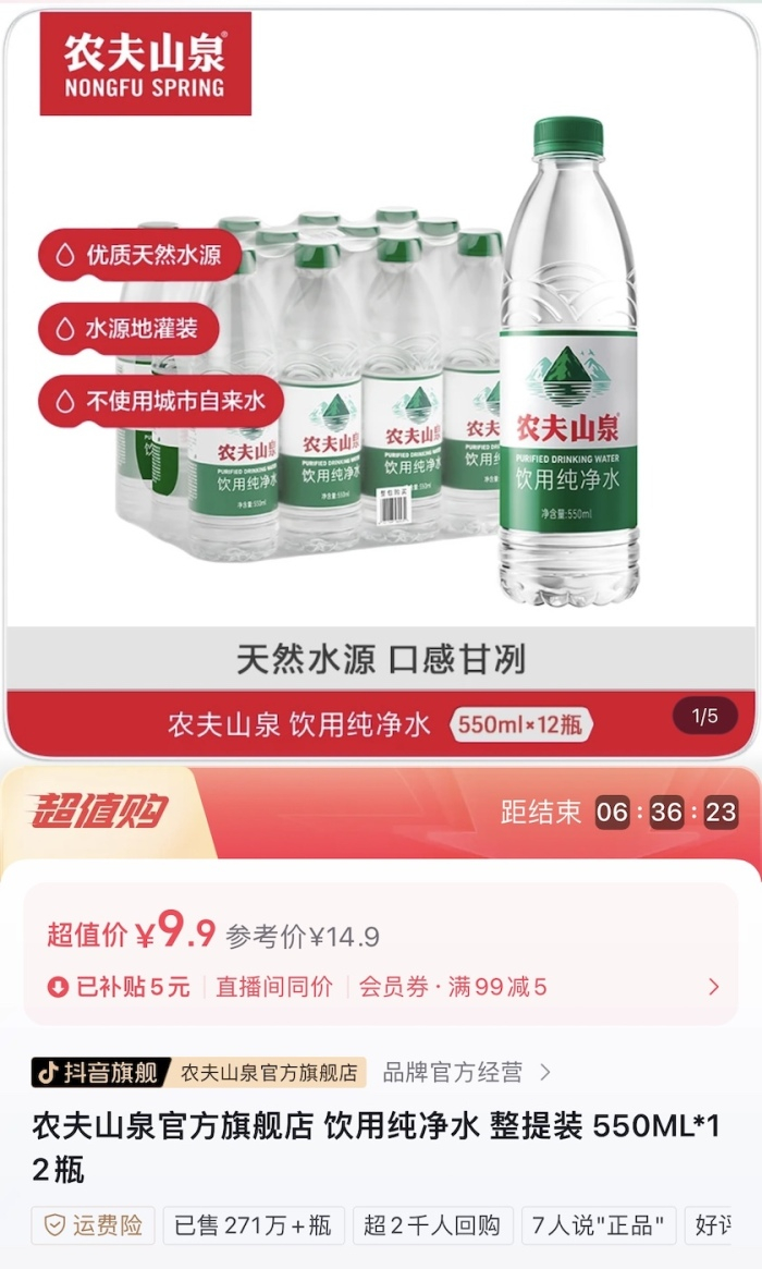 618期间,农夫山泉官方旗舰店将绿瓶纯净水12瓶装500ml的售价,降到了9.9元,平均一瓶0.825元,远低于零售价同处于2元价格带的怡宝、娃哈哈等瓶装水。