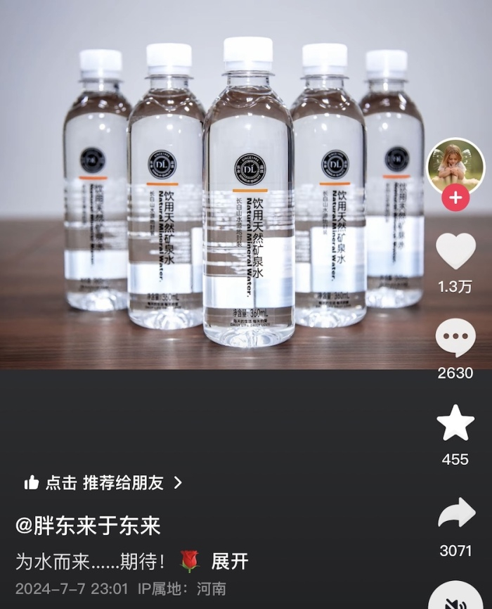 胖东来董事长于东来近日在社交平台披露,胖东来或将推出自有品牌矿泉水。这款名为“饮用天然矿泉水”的产品为长白山水源地封装,净含量360ml,瓶身上印有清晰的“DL”标志。
