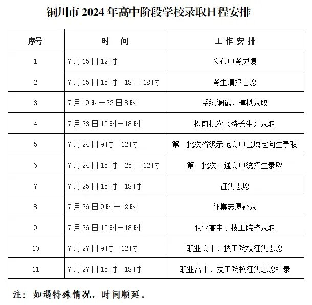 经铜川市高中阶段学校招生工作领导小组研究同意,现将2024年铜川市普通高中、职业高中和技工院校招生各批次录取最低控制分数线及录取日程安排予以公布: