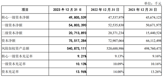 招股书显示,2021年至2023年,广州银行资本充足率分别为13.26%、14%、13.96%;一级资本充足率为10.16%、10.09%、10.13%;核心一级资本充足率为 9.16%、9.13%、9.21%。