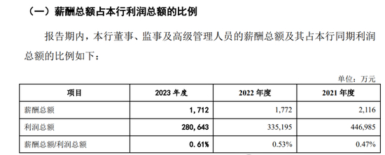 总体来看,广州银行高管薪酬已连续三年下降,2021-2023年高管薪酬总额分别为2116万元、1772万元、1712万元;2021-2023年高管人均薪酬分别为123.06万元、112.39万元、110.79万元。
