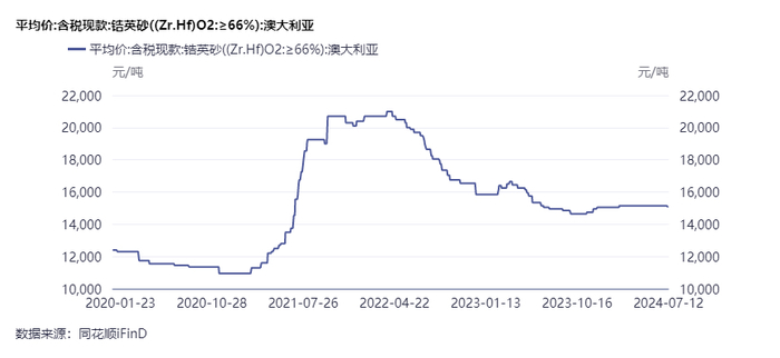 笔者还发现,导致东方锆业的业绩下滑的因素,还有锆矿市场价格波动。据同花顺iFinD数据,以平均价格计算,锆英砂价格自2021年初开始快速上涨,2021年第四季度涨至较高位置,涨幅近九成;2022年4月,锆英砂价格开启回调,目前较高位降幅约37%,降回2021年7月的水平。