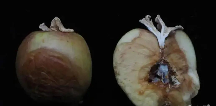 至于苹果上为什么会突然长出蘑菇,专家的分析有两种可能性,一种情况是苹果在运输过程中,有孢子掉在苹果上,而苹果又刚好有伤口,孢子先侵染苹果果柄,随后向下逐渐扩散到果核,当温度湿度都适合裂褶菌生长时,子实体就从苹果顶部长出来了。