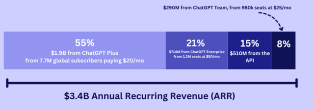 ChatGPT Team主要面向中小企业和团队用户,每个账户收费25美元/月。这一版本为OpenAI贡献了8%的收入,约2.9亿美元,估计有98万个用户。