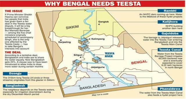 然而,孟加拉国专家表示,印度在提斯塔河上游修建的水坝限制了流往下游孟加拉国的河水流量,并影响了10多万公顷土地的灌溉。《印度教徒报》也指出,提斯塔河83%的集水区都位于印度,只有余下的17%在孟加拉国。