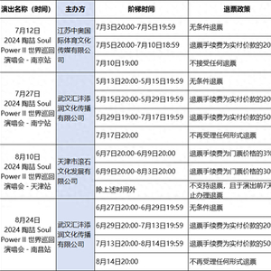➤ 2024年8月17日,“万物安生时”李健巡回演唱会苏州站,其购票政策规定的阶梯退票中2024年8月5日00:00至2024年8月13日23:59时间段需要收取50%手续费。