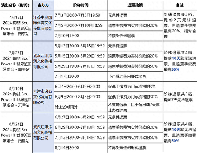➤ 2024年7月19日,蔡依林巡回演唱会合肥站的退票政策第三档为7月13日00:00至2024年7月14日24:00,收取手续费为门票实际支付价格的50%。