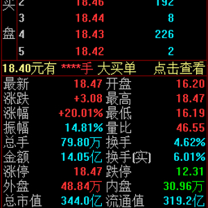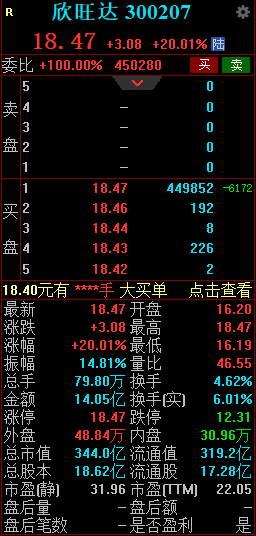 7月16日消息,欣旺达早间快速拉升触及20cm涨停,截止发稿报18.47元/股,成交额14.05亿元,换手率4.62%。