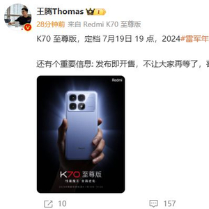 小米王腾:Redmi k70 至尊版手机定档 7 月 19 日晚,发布即开售