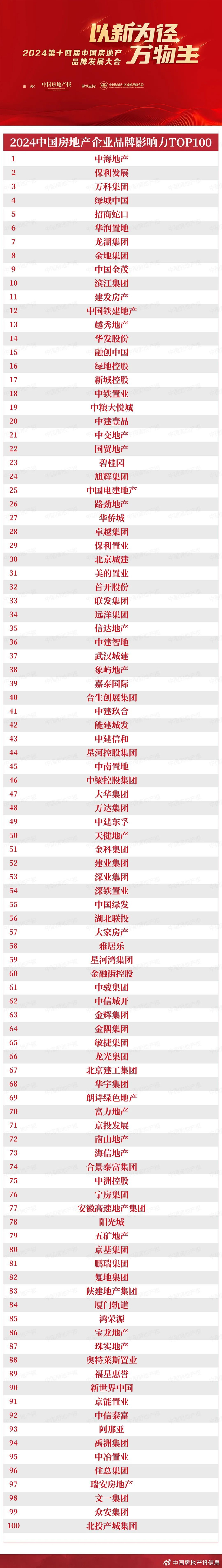 2024中国房地产企业品牌影响力TOP100揭晓!这些企业名列前茅
