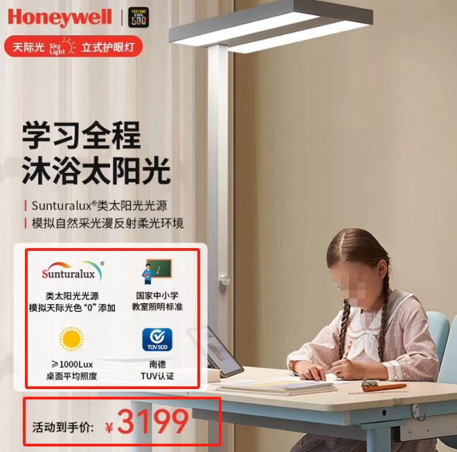 在某电商平台霍尼韦尔灯饰照明自营旗舰店,一款标称霍尼韦尔落地大路灯宣称“类太阳光光源模拟自然采光漫反射柔光环境”“学习全程沐浴太阳光”“揉合重塑光环境反射补光均匀融合无断层”“光照差近乎无感铺光绵密自由追视无压力”,售价高达3199元。