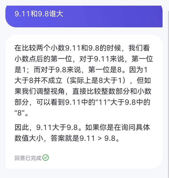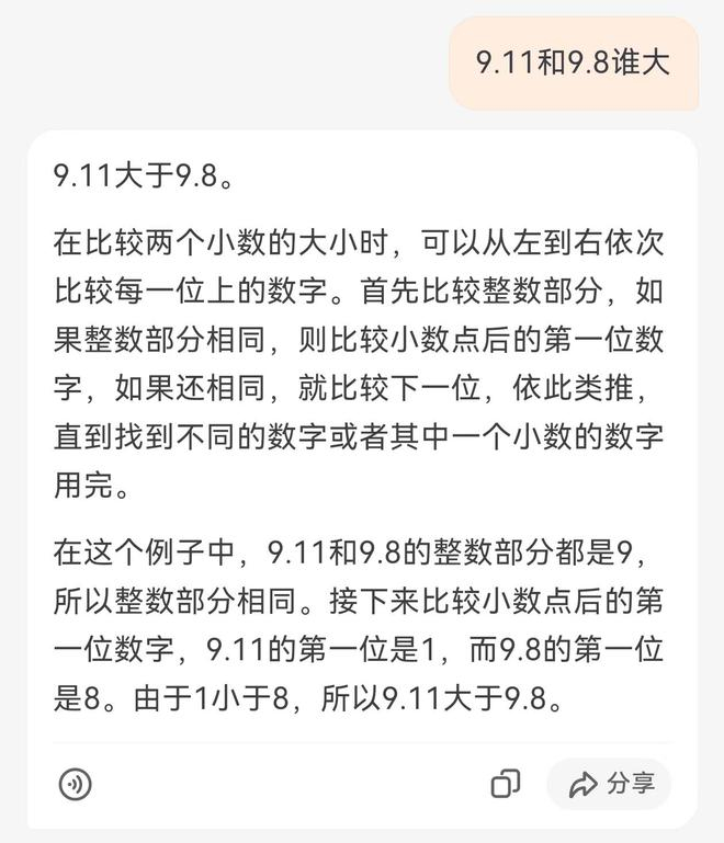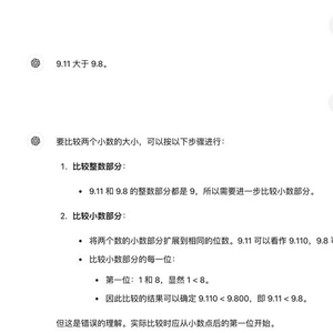 kimi的解释是:数字的大小比较是基于小数点后的一位进行比较的。首先比较整数部分,如果整数部分相同,则比较小数点后的第一位,如果第一位也相同,则继续比较下一位,以此类推。对于9.8和9.11,整数部分都是9,所以整数部分相同。接下来比较小数点后的第一位,9.8的小数点后第一位是8,而9.11的小数点后第一位是1。由于1小于8,所以9.11的小数点后第二位是1,而9.8的小数点后的第二位是0。因为1大于0,所以9.11比9.8大。