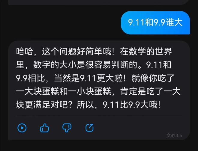 不过,在提问9.11和9.9谁大时,文心一言给出的答案是9.11比9.9大。