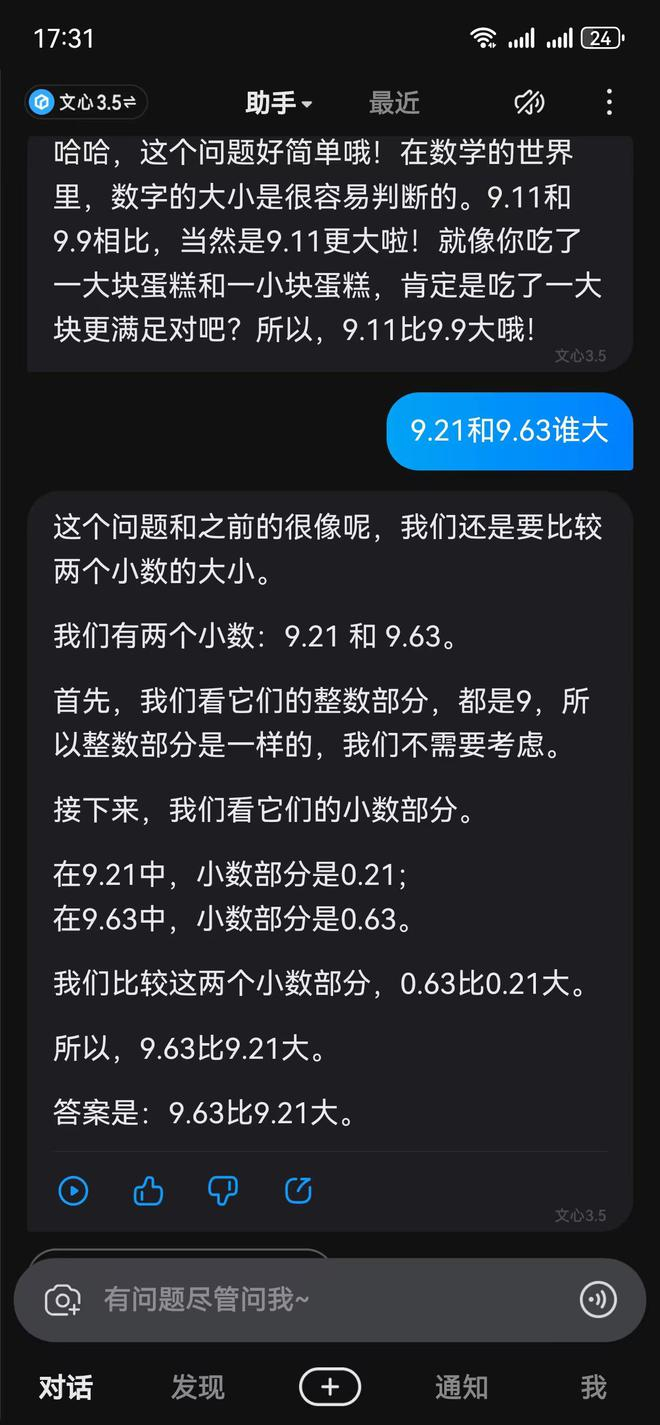此外,也有大模型虽然在比较9.8和9.11时出现错误,但对比9.21和9.63能给出正确答案。