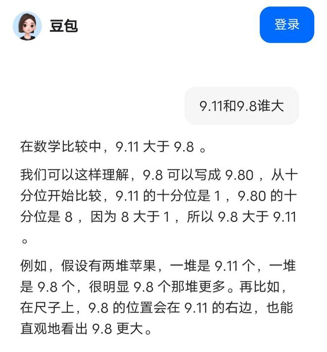其中,豆包给出的答案为9.11大于9.8,但解释中是9.8更大,前后矛盾。