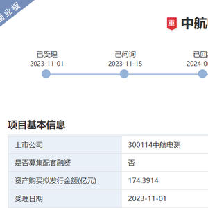 根据深交所官网,中航电测重大资产重组报告书于2023年11月获得受理,当月进入问询阶段。