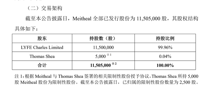 据健友股份披露,Meitheal的原股东分别为LYFE Charles Limited(以下简称LYFE)和Thomas Shea,分别持股99.96%和0.04%。公告显示,LYFE的注册地为开曼群岛,注册资本为5万美元;而Thomas Shea先生为Meitheal首席执行官。