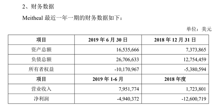 值得注意的是,当时Meitheal的所有者权益甚至为负,截至2019年6月底为-1017万美元。