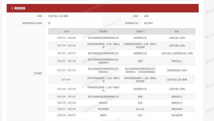 2015年4月,洲岭私募成立,赵晋担任法定代表人。